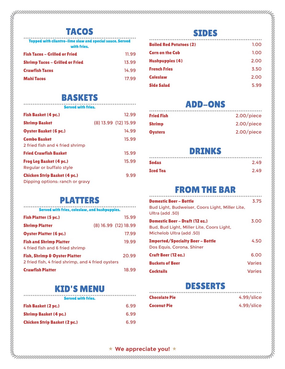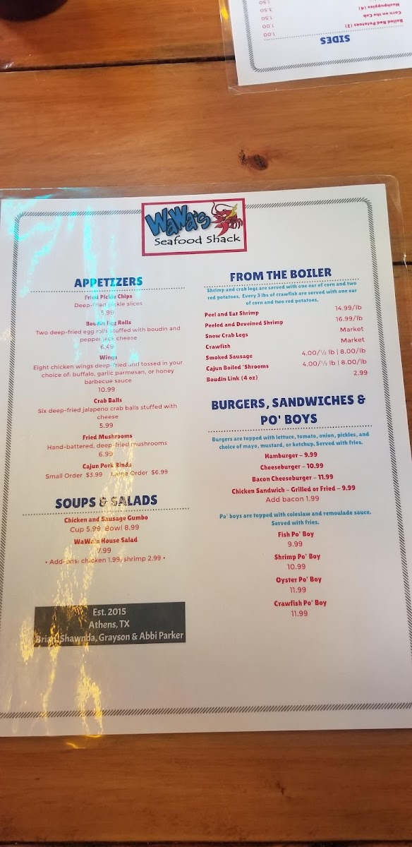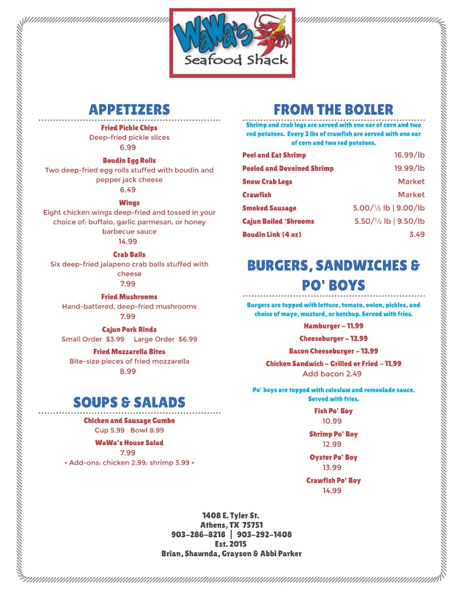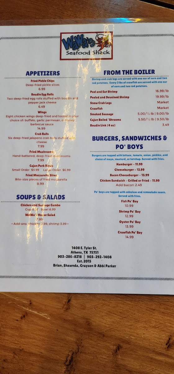 Overall, the menu reflects a straightforward approach to seafood, prioritizing flavor and accessibility. Whether you're seeking fried favorites, boiled seafood, or something grilled, the selections complement the warm, unpretentious character of WaWa’s, making it a practical and relaxed stop in Athens, Texas.